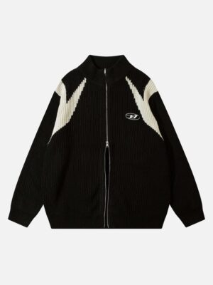 American Style Color Blocking Zipper Cardigan Sweater Loose Knit-1509